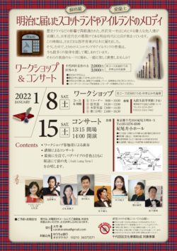 In the Meiji Era, many Scottish and Irish folk songs were introduced to Japan, and they are still very popular among Japanese people. Workshops for instrumentalists and singers will be followed by a concert by the participants.